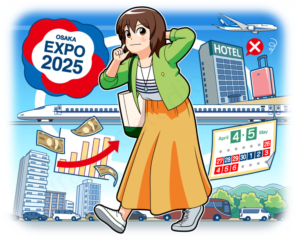 その周囲には、大阪万博、物価高、連休の並びの悪さ、予約困難な宿泊施設──という、出かけたい気持ちと控えたい気持ちを揺さぶる4つの要素をミニイラストで表現し、それらを楕円状に繋げて関係性を視覚的に表現しました。